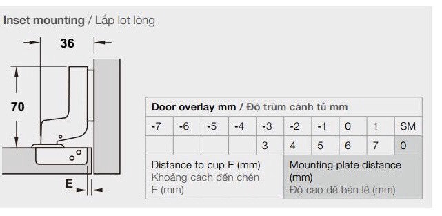 - Điều chỉnh: Điều chỉnh mặt bên ±2 mm, điều chỉnh chiều cao +2 mm (qua đế bản lề), điều chỉnh chiều sâu ±2 mm