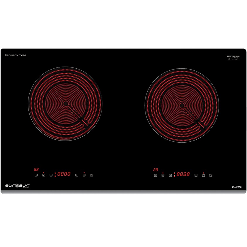 Eurosun EU-IF268 thuộc dòng bếp điện từ 2 vùng nấu có 10 mức gia nhiệt và được điều khiển bằng cảm ứng có màn hình LED hiển thị các thông số, chống quá tải nhiệt, kèm theo khóa trẻ em, giúp trẻ không bấm được vào bếp trong quá trình nấu vô cùng an toàn.
