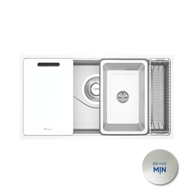 - Tích hợp phụ kiện thông minh: Thớt nhựa, rổ phụ, giá úp bát, siphon