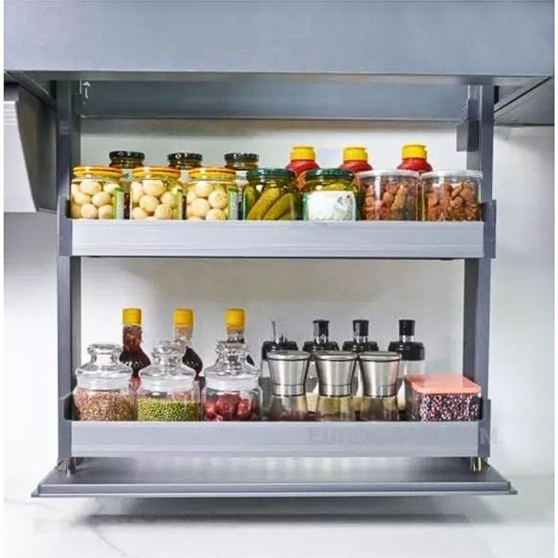- Khu vực tủ bếp trên thường được dùng để lưu trữ bát đĩa thì nay với giá gia vị điện, gia chủ có thể tận dụng để sắp xếp bảo quản các chai lọ gia vị một cách gọn gàng, tối ưu nhất.