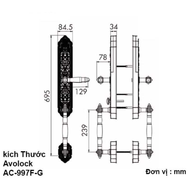 - Kích thước thân khóa ngoài (R x C x D): 84.5 x 710 x 34 mm