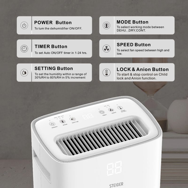 - Máy hút ẩm Steiger STG – 820DW 20L tính năng kiểm soát và hút ẩm liên tục: Máy hút ẩm Steiger STG – 820DW có khả năng kiểm soát chính xác và hút ẩm liên tục để ngăn ngừa tình trạng ẩm ướt hiệu quả và khả năng ức chế sự phát triển của vi khuẩn nấm mốc gây mùi để giữ cho không gian nhà bạn luôn được khô giáo, thoáng mát. Hơn nữa, thiết bị còn được trang bị một loạt các chế độ điều chỉnh độ ẩm để duy trì độ ẩm lành mạnh và đáp ứng mọi nhu cầu sử dụng độ ẩm khác nhau của người dùng.