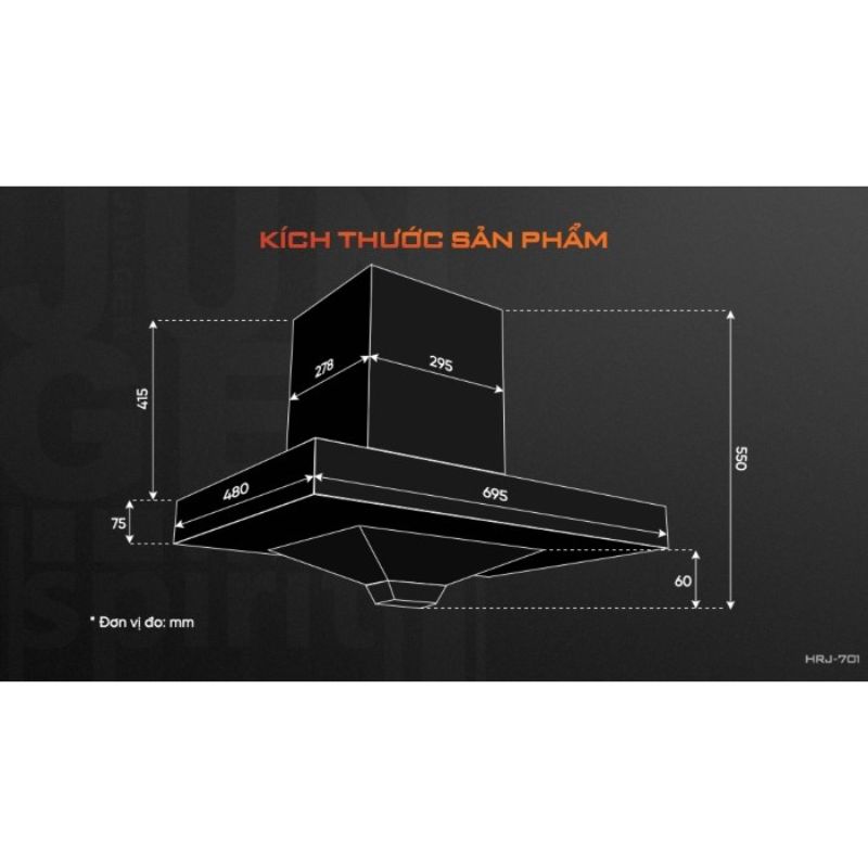 - Kích thước sản phẩm: 695 (ngang) x 480 (sâu) x 550 (cao) mm (đã bao gồm lưới lọc và khay hứng dầu)