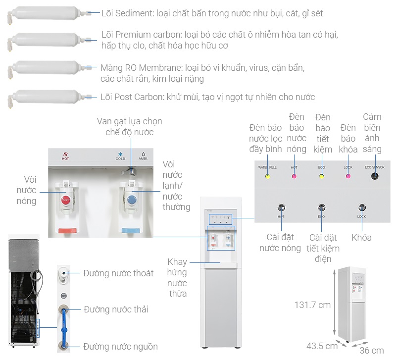 – Với kiểu dáng đứng màu trắng tao nhã, chất liệu vỏ tủ, bình chứa nước bằng nhựa BPA FREE an toàn sinh học đạt chuẩn NSF bền đẹp, an toàn cho sức khỏe.