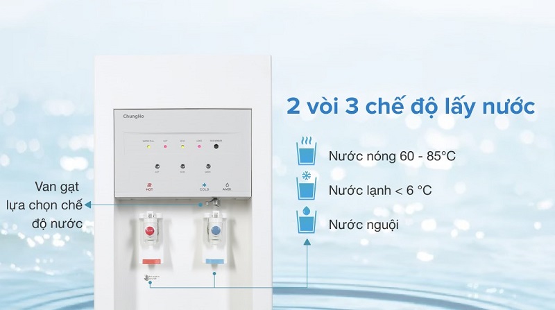 – Máy lọc nước RO nóng lạnh có 3 chế độ nước: nước thường, nước nóng từ 60 – 85 độ C, nước lạnh dưới 6 độ C đáp ứng đa dạng nhu cầu sử dụng như: uống, pha trà, pha cà phê, chế mì,…