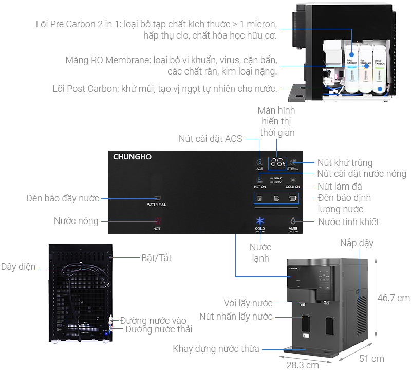 - Lõi RO/Nano/UF: RO 50 GPD sản xuất Hàn Quốc