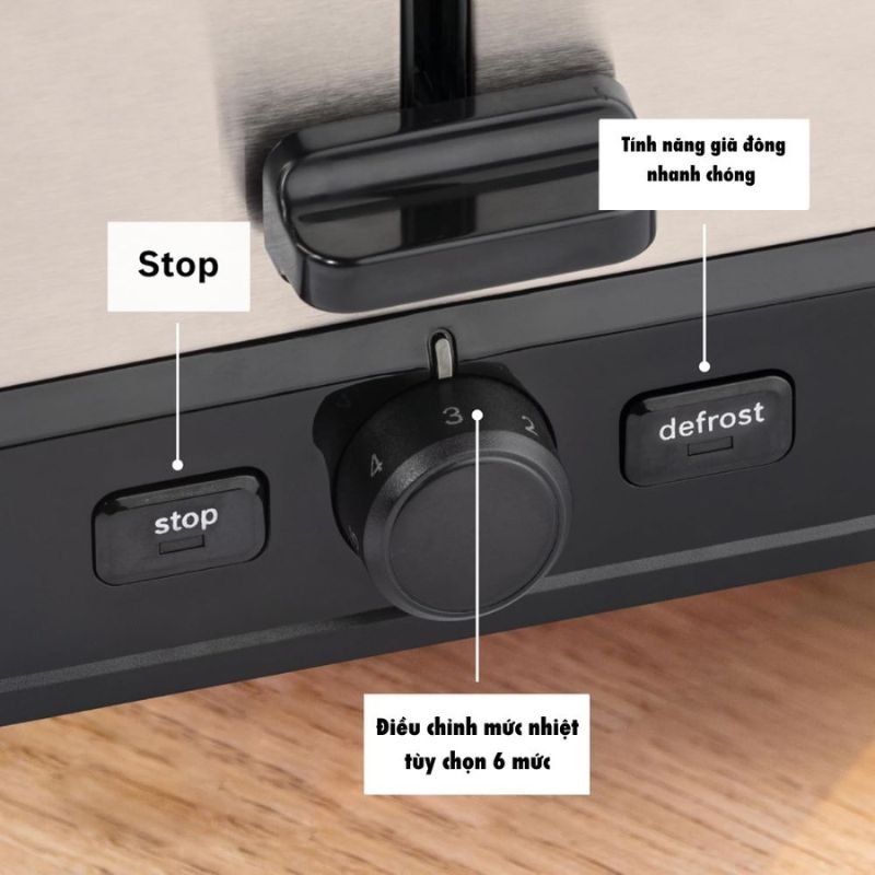 - Chế độ rã đông và hâm nóng tiện lợi: Không cần rã đông trước, máy có thể làm nóng bánh mì đông lạnh trực tiếp. Chức năng hâm nóng giúp bánh luôn giòn, không bị khô hay cháy.