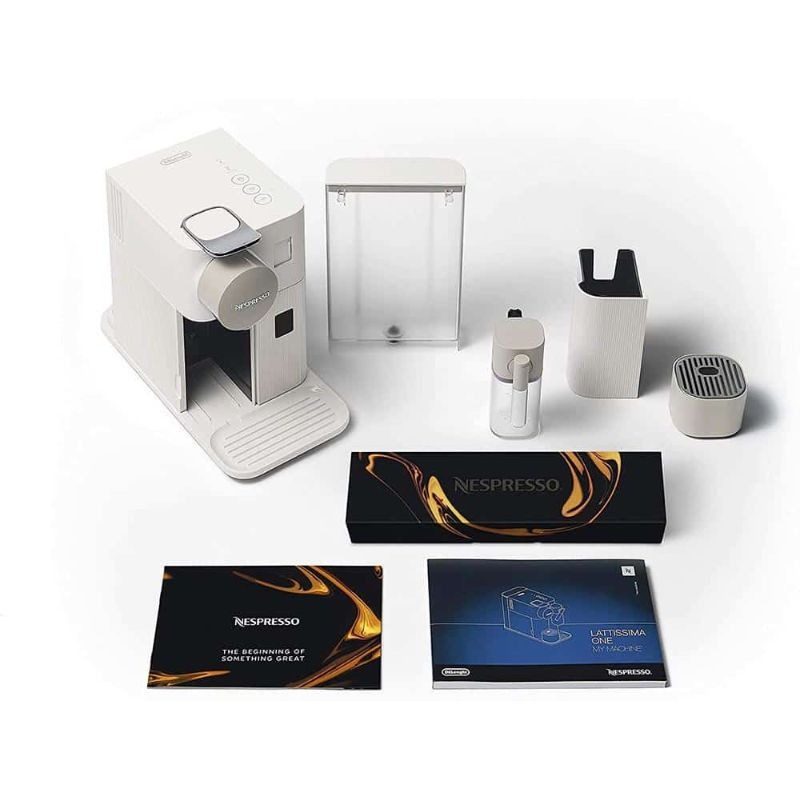 - Phụ kiện đi kèm đa dạng: Máy pha cà phê viên nén Delonghi Nespresso Lattissima One EN 510.W với lượng phụ kiện đi kèm rất đầy đủ và đa dạng: Sách hướng dẫn sử dụng, sách công thức coffee, hộp 10 viên nén coffee với hương vị khác nhau, khay kê cốc thấp ngoài ra còn có bình đựng nước sau máy, bình đựng sữa đánh sữa, khay đựng bã viên nén.