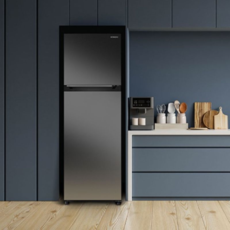 - Tủ lạnh Hitachi với thiết kế kiểu dáng ngăn đá trên, tone màu đen dễ dàng kết hợp với nội thất trong nhà.