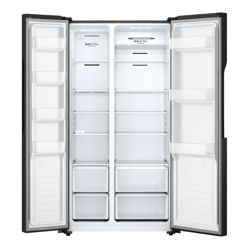 - Tổng quan thiết kế: Thuộc dòng tủ lạnh Side by side, chất liệu cửa tủ được làm từ thép không gỉ bền đẹp với thời gian, màu đen sang trọng phù hợp với nhiều kiểu thiết kế nội thất. Tay nắm cửa được thiết kế âm tinh tế giúp tổng thể gọn gàng, tối giản và hiện đại. Không gian phù hợp nhất để đặt tủ là nhà bếp, tạo sự hiện đại và tiện nghi. Dung tích 519 lít thích hợp với gia đình từ 4 – 5 thành viên hoặc ít thành viên hơn nhưng nhu cầu trữ thực phẩm cao.