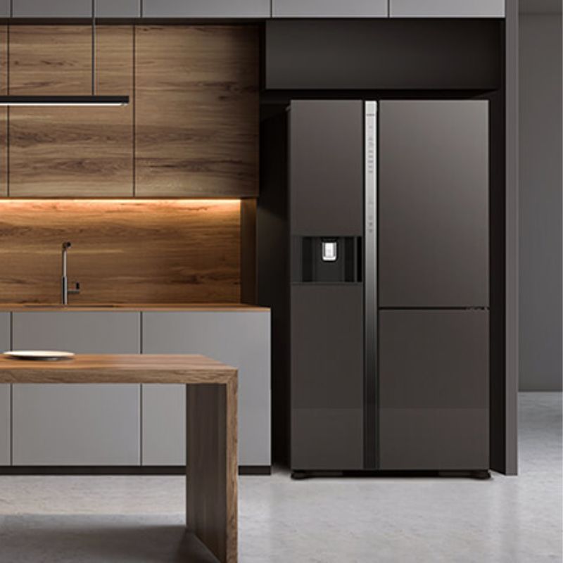 - Thiết kế: Hitachi MX800GVGV0 GMG thuộc dòng tủ lạnh lớn – Side by side có 3 cánh cửa, thiết kế thanh lịch từ bên trong đến bên ngoài, các chi tiết tinh tế, tông màu xám thời thượng, tạo điểm nhấn cho gian bếp thêm cao cấp, hiện đại. Cửa tủ lạnh sử dụng mặt kính nguyên khối thiết kế phẳng tràn viền sáng đẹp, góp phần nâng cao tính thẩm mỹ cho thiết bị và không gian bố trí. Dung tích sử dụng 569 lít, lựa chọn phù hợp dành cho các hộ gia đình có trên 5 người, hoặc gia đình ít thành viên hơn nhưng có nhu cầu lưu trữ thực phẩm nhiều hoặc phục vụ cho nhu cầu kinh doanh.